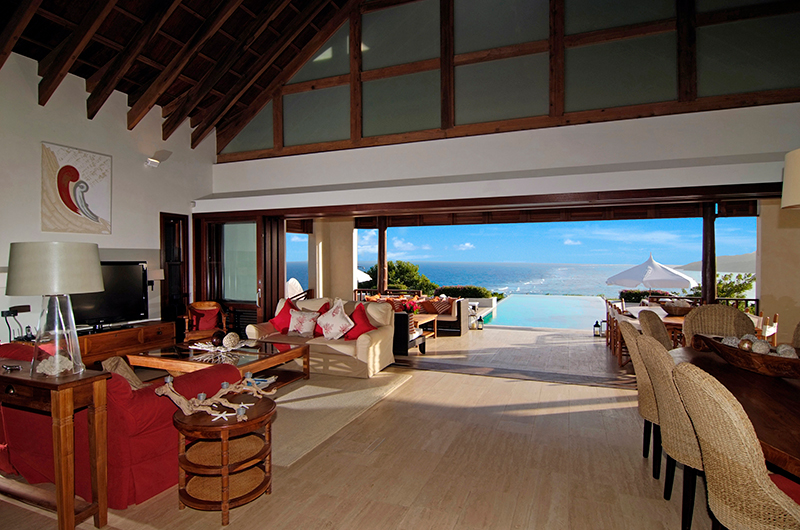 The living room is light and airy space with a lofty high ceiling, with glass doors opening to the poolside deck. Two sofas are positioned before a flatscreen TV with a collection of DVDs to keep you entertained. This space is air-conditioned though you might prefer to leave the doors open to enjoy a fresh breeze blowing in from the ocean.