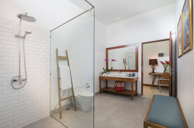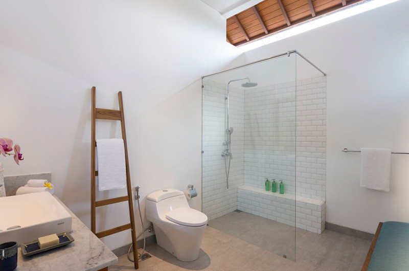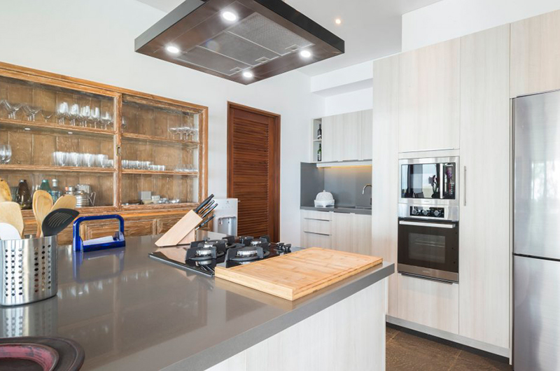 The dining table sits in the same room with the living area and seats up to six. There’s also an outdoor dining and barbecue area. The villa includes a compact guest kitchen and a separate staff kitchen.