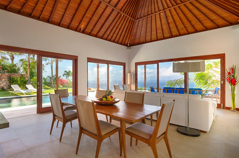The living room houses white sofas and offers amazing views of the pool and ocean through sliding glass doors. The living room can be fully enclosed when needed. There’s additional lounge seating out on the patio.