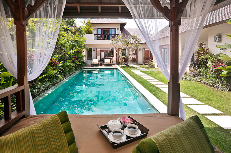 Villa Songket fully embraces its lush Balinese surroundings with vibrant tropical gardens framing an 11-metre swimming pool – the perfect escape from the tropical sun. The pool is flanked by a pair of sun beds and a romantic poolside bale gazebo.