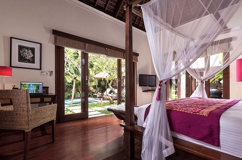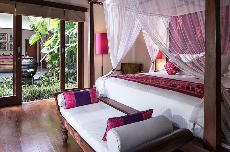 The fuchsia themed master bedroom is separated from the main house by a lotus pond. The room features a king-sized four poster bed, TV/DVD, a writing desk and a walk-in wardrobe leading to an ensuite bathroom with a bathtub and shower.