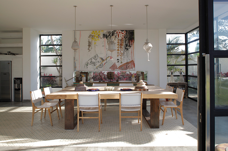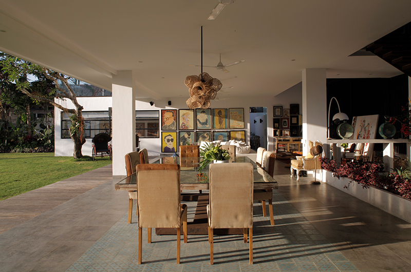 Villa Suami has a huge wooden dining table located adjacent to the well-equipped kitchen, allowing guests to dine in an enclosed indoor setting. A second dining table is located in the open-sided living room lounge.