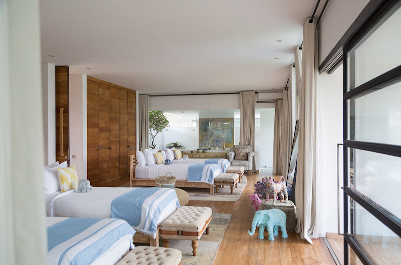 Villa Suami has five bedrooms. Three rooms have king-sized beds and one room has a double bed. One room has four single beds which can also be set up as two king-sized beds if needed. There are two bedrooms up on the first floor, one bedroom is on the ground floor and two rooms are located side by side on a level below the main pool.