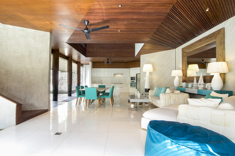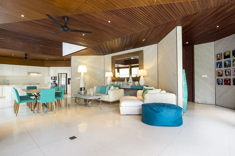 Villa Summer’s ground-floor living room has an open-sided layout which allows guests to jump directly to the pool. The room is furnished with generous sofas, with white and blue hues creating a fresh beach house feel. There is a separate TV lounge upstairs on the first floor.