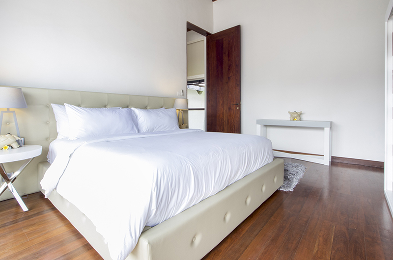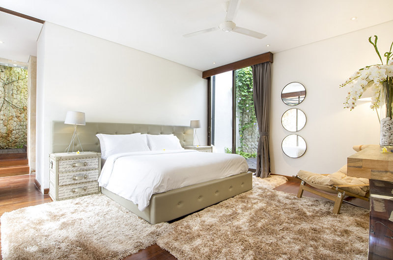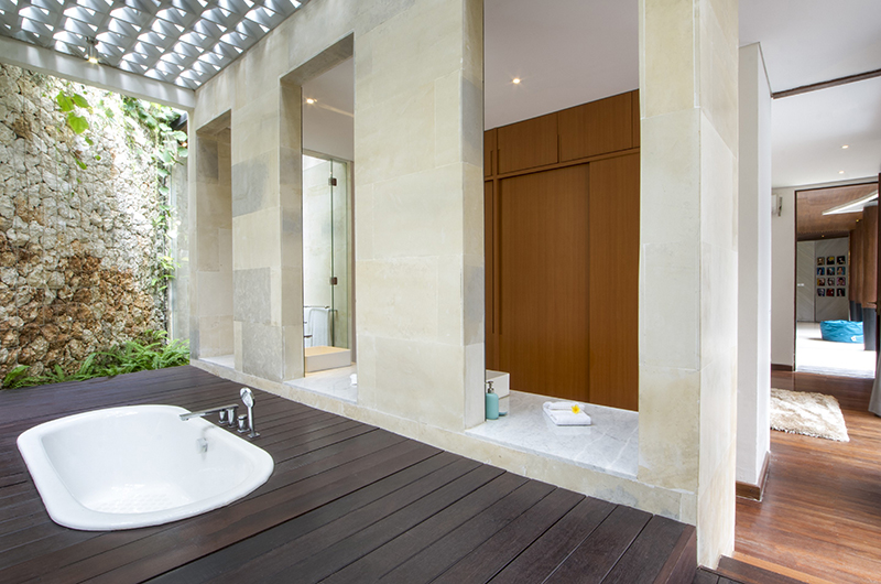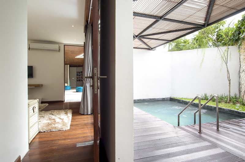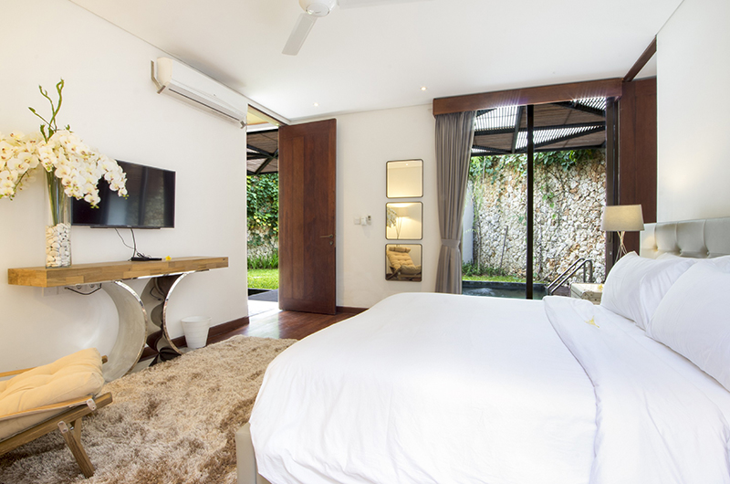 Villa Summer’s master bedroom is located on the ground floor. The room has a queen-sized bed, a TV and an ensuite bathroom with a sunken bathtub. The room also has access to a private plunge pool