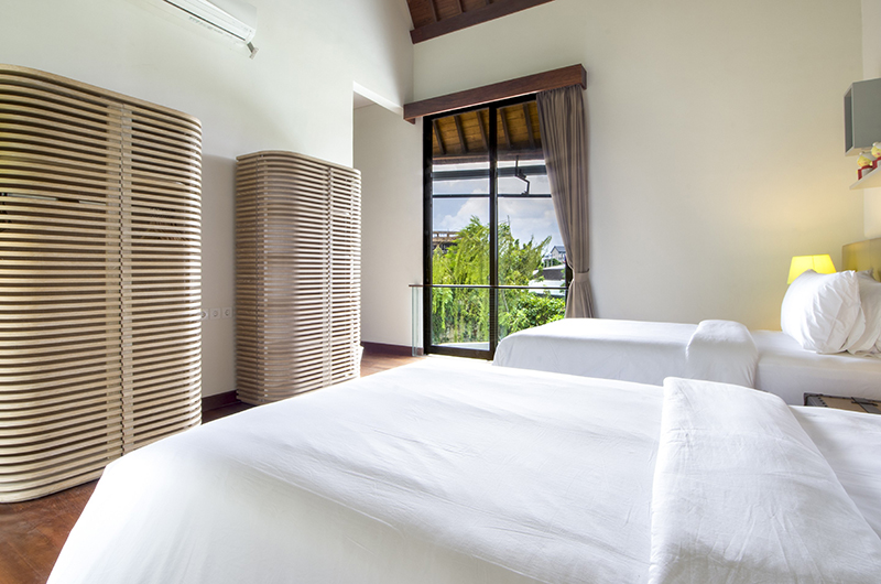 Villa Summer has three bedrooms. Two bedrooms have queen-sized beds and one room has two single beds. The master bedroom is located on the ground floor and the two guest bedrooms are housed upstairs on the first floor.