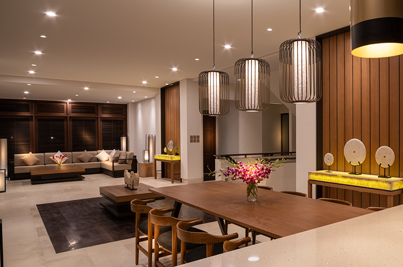 The living and dining pavilion is housed on the villa’s upper level. This open-plan space houses comfortable sofas and chairs with views of the pool and ocean visible through floor-to-ceiling windows.