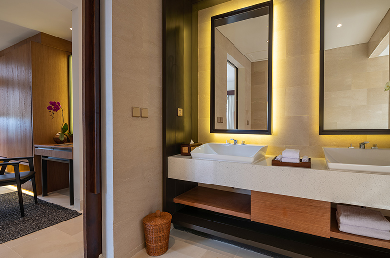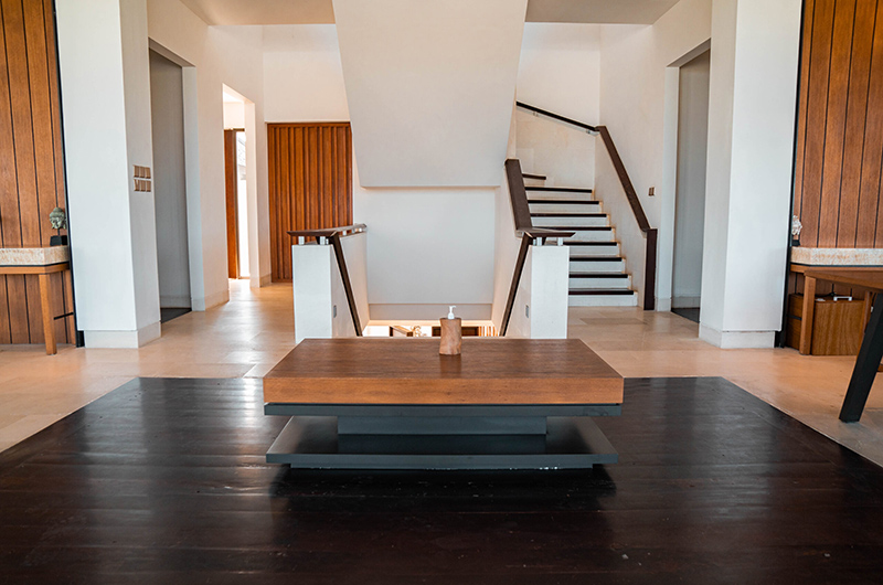 Villa Surga Two is divided over three levels. The ground level welcomes guests in with a waterfall entrance patio. This floor also features the villa’s spa pavilion and games room. The upper level comprises the living and dining areas and media room as well as housing the three guest bedrooms. The lower floor houses two more bedrooms and a living area. The upper floor houses the two remaining bedrooms.
