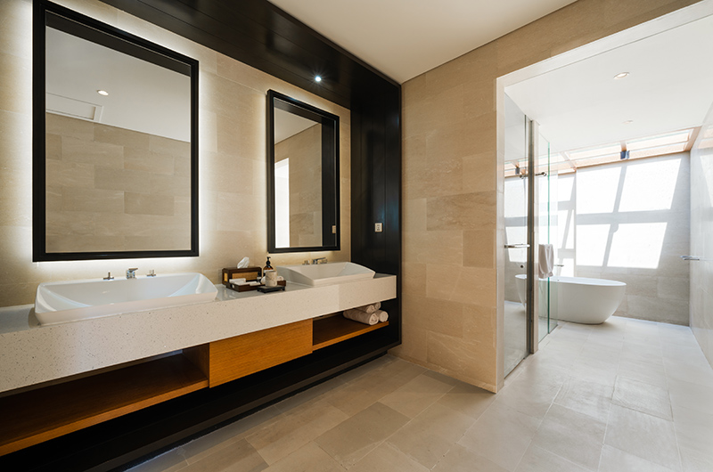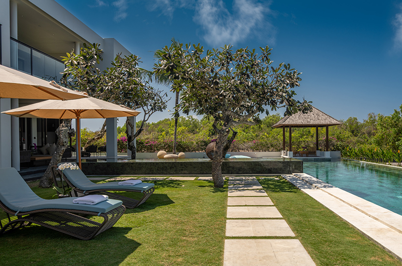 Villa Surga Two has a massive 21-metre pool with an infinity edge extending into epic views of the Indian Ocean. The pool is surrounded by white sun loungers and matching parasols and there’s a covered bale at one end of the pool. You can also enjoy the shade on the terrace, where lounge furniture creates an alternative outdoor living room. After sunset, an impressive stainless steel torch lights up the pool area.