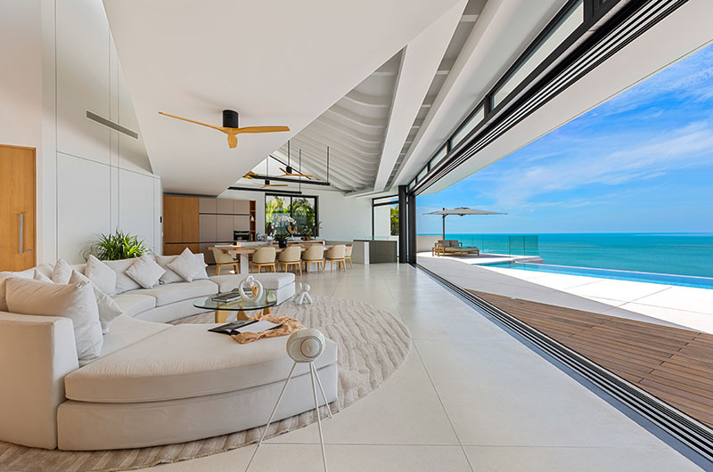 Villa Sutra is a four-bedroom villa that’s built over three levels. The villa features generous living areas which can be fully enclosed or left open; a cinema room; TV room; spa room; sauna; steam room; and a gym/games room. The four ensuite bedrooms are divided over three floors: one on the top floor, one on the main floor and two on the lower ground floor. The villa features a large sun deck and an 18-metre-long infinity pool with a shallow section for children.