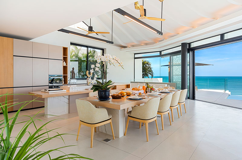 The dining area hugs the lounge room seamlessly and offers the same sensational ocean views – it really is hard to imagine a more scenic setting. The light timber dining table with its 10 matching chairs perfectly complements the room’s light interiors. The dining area extends to an open-plan kitchen that’s fully loaded with all the kitchenware and gadgets you might need, including a coffee maker, juicer, wine fridge and rice cooker. A barbecue is also available.
