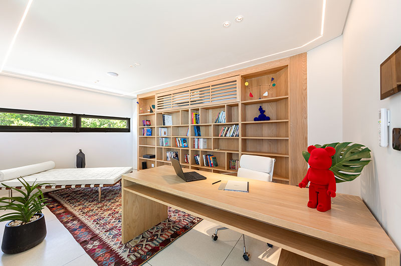 The living room is a fabulous space that both captures those amazing panoramas and embodies the villa’s signature style. The room centres around a cool circular sofa that looks futuristic and retro chic at the same time. Wood panelling further plays up the room’s retro feel, with gilded statues perched close to the ceiling adding a surrealist twist to the space. This room can be left open to enjoy direct access to the poolside deck, or you can close the glass doors when you want a break from the elements.