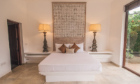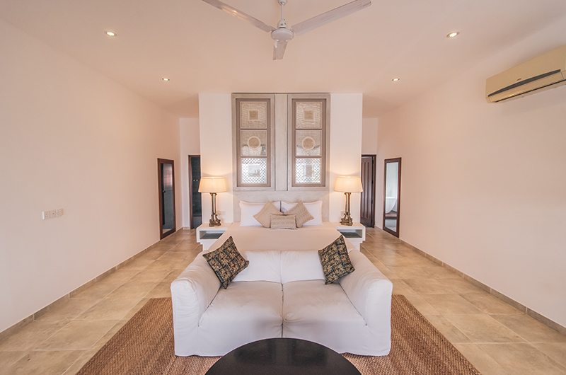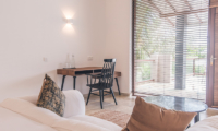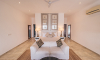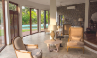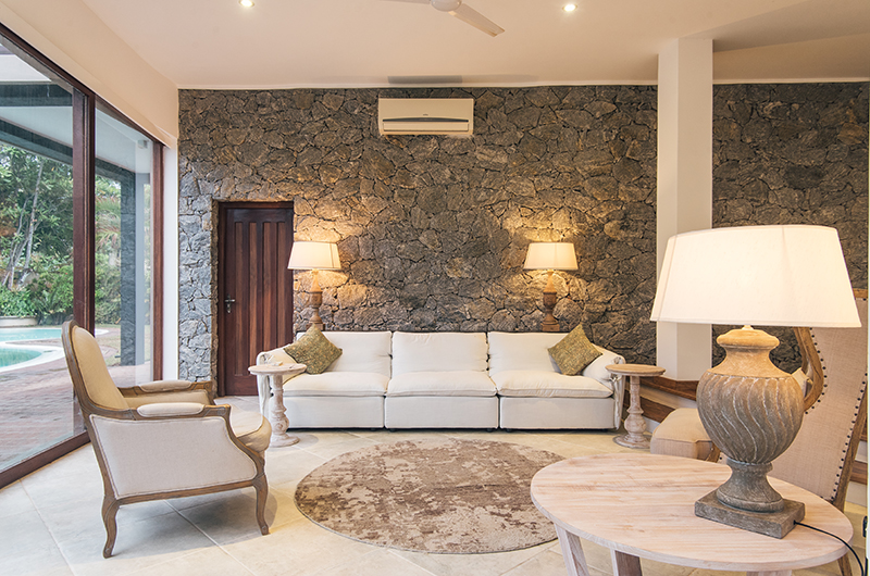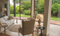 The living room is located on the ground floor, with full-wall windows looking out to the pool and garden. The room is furnished with a pillowy white sofa and two rococo inspired armchairs, with an HD TV with satellite channels and a DVD player offering in-villa entertainment.