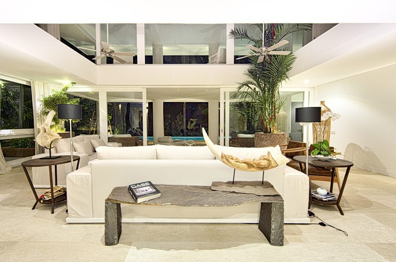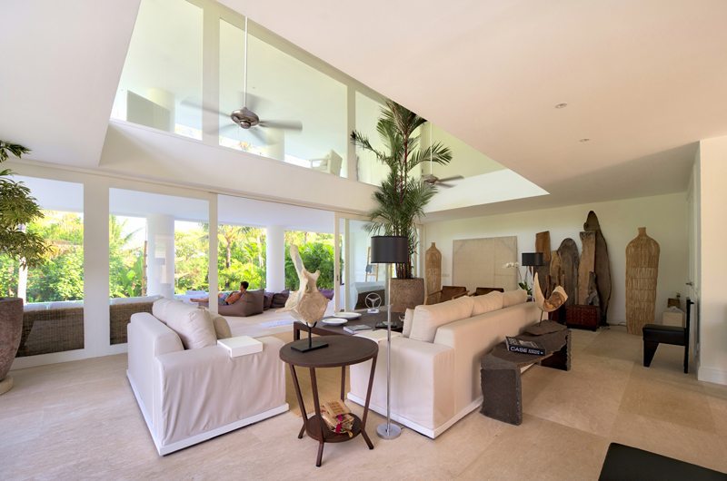The open-plan living room overlooks the pool on the villa’s first floor. The room houses white sofas and unique art carved from natural wood.