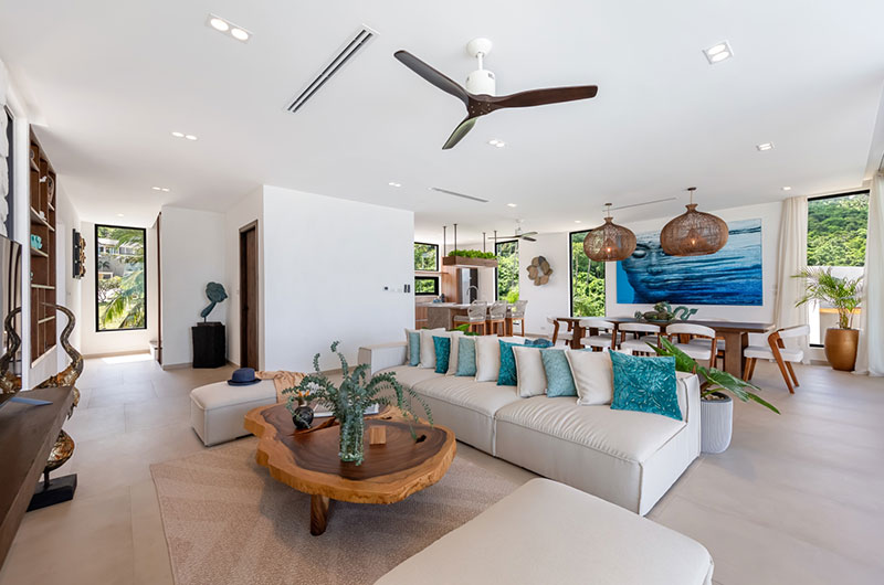 Villa Vida Samui is a beautiful example of modern tropical architecture. The villa is dominantly white and features generous stretches of full wall glass. The décor amps up this luminous theme by focusing on white hues, blue accents, and touches of natural timber. The villa spans three floors, allowing everyone to gather up on the main floor and then retreat to their private quarters when you need a little me-time.