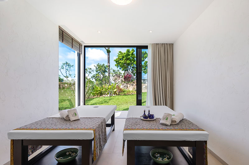 Located on garden level, the villa’s peaceful spa room allows you to enjoy Thailand’s famous spa traditions without leaving the villa. The room features two massage beds, allowing for simultaneous massages.