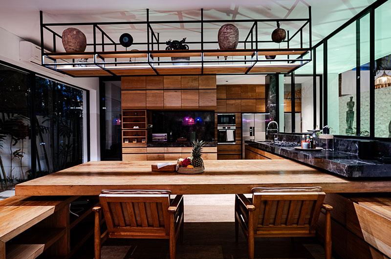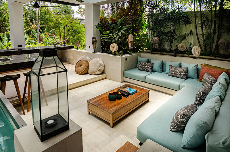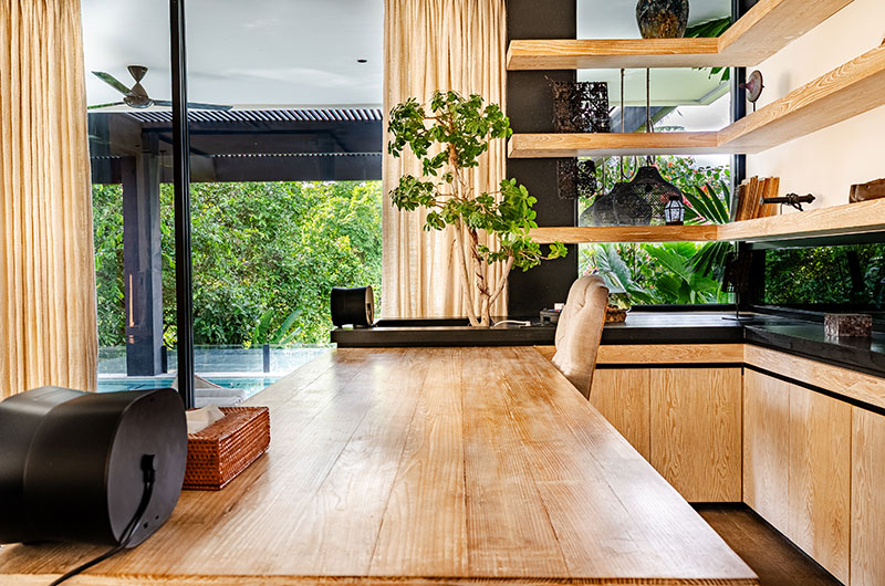 Thanks to its grand proportions and expertly chosen furniture, the villa’s living room is guaranteed to impress. Looking out to blissful views of the pool and surrounding greenery, the space is dominated by a fabulous cream coloured lounge that can seat your full crew – and then some. The room is adorned with art and mementoes giving beautiful nods to Bali and other Indonesian islands.