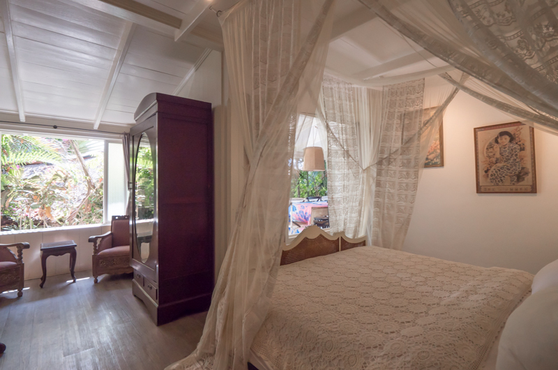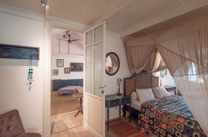 The second bedroom is located on the other side of the living room in the main house. This white themed bedroom is furnished with a king-sized canopy bed and adjoined by a beautiful ensuite bathroom with a freestanding bathtub, standalone shower and dual sinks.