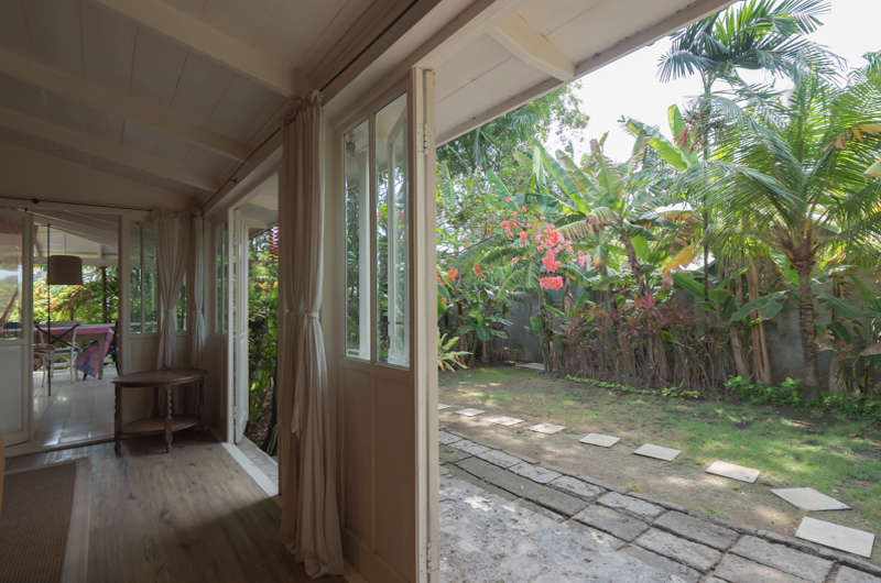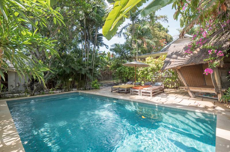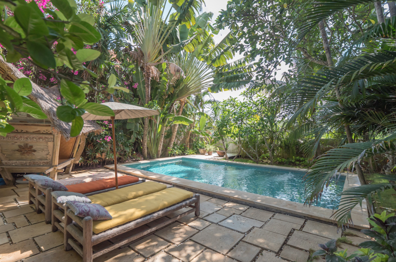 White House has a large swimming pool which looks out to neighbouring rice fields through a thicket of tropical palm trees. The pool is surrounded by sun loungers and flanked by a small yoga deck. The thatched roof bale beside the pool is ideal for relaxing in the shade.