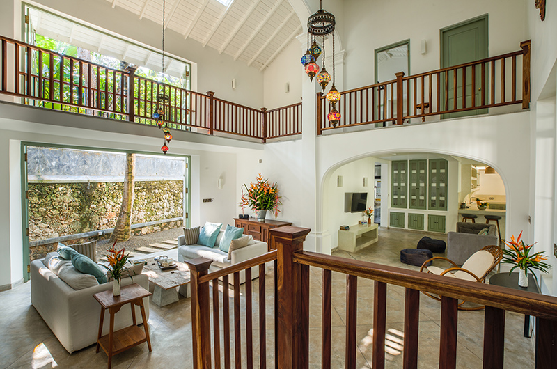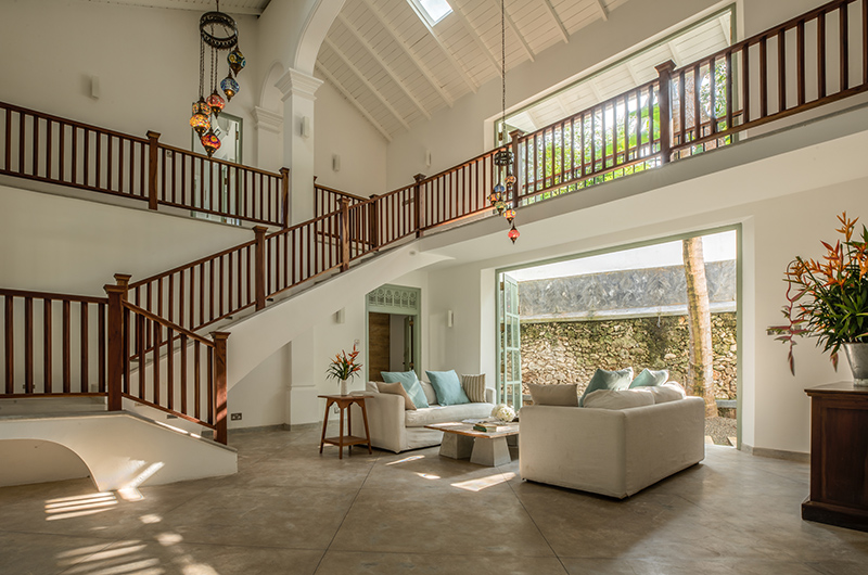 Wijaya Giri’s main living room is lined with scenic French windows looking out to the garden and furnished with plush sofas. The adjoining sitting room offers more seating and a flatscreen TV.