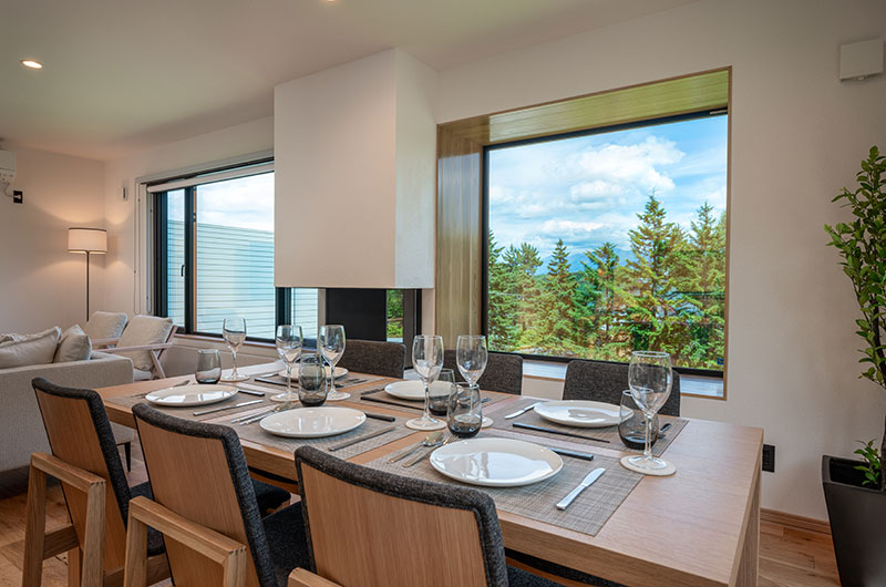 The open-plan living room occupies the chalet’s upper floor with generous windows offering dreamy views over Furano’s treetops and neighbouring chalets. The lounge area is decorated in muted tones that feel very Scandi chic. You can kick back on the grey sofas (or opt for one of the armchairs instead) and stream your favourite shows on the smart TV that’s mounted on the opposite wall.