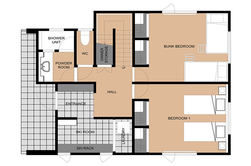 Wildwood is a three-bedroom chalet that’s built over two floors. The ground floor houses the ski room, laundry room, two bedrooms and a guest bathroom. The upper floor houses the living and dining areas and the third bedroom.