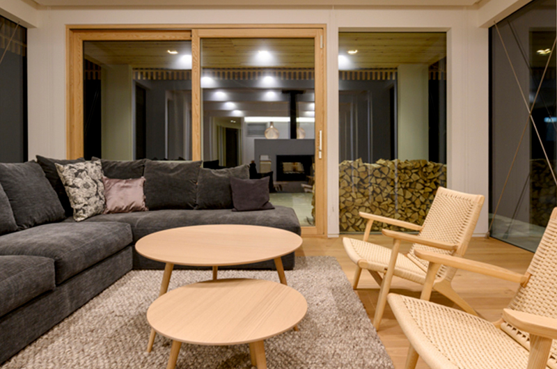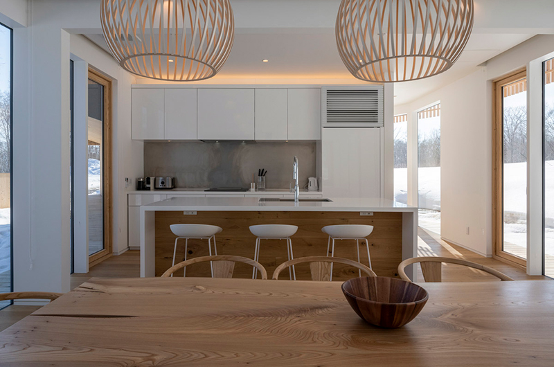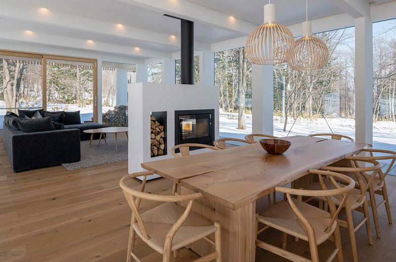 The living room feels like a stunning gallery that’s meant to be lived in and enjoyed to the fullest. The space is accentuated by white pillars and ceiling beams that frame full wall windows looking out to pristine Niseko landscape. The space is dominated by a beautiful fireplace that cleverly divides the living and dining areas without interrupting the open floor plan. The lounge area features a generous grey sofa, circular coffee tables and two wicker chairs that seem to mimic the textures and shades of the firewood waiting by the fireplace.