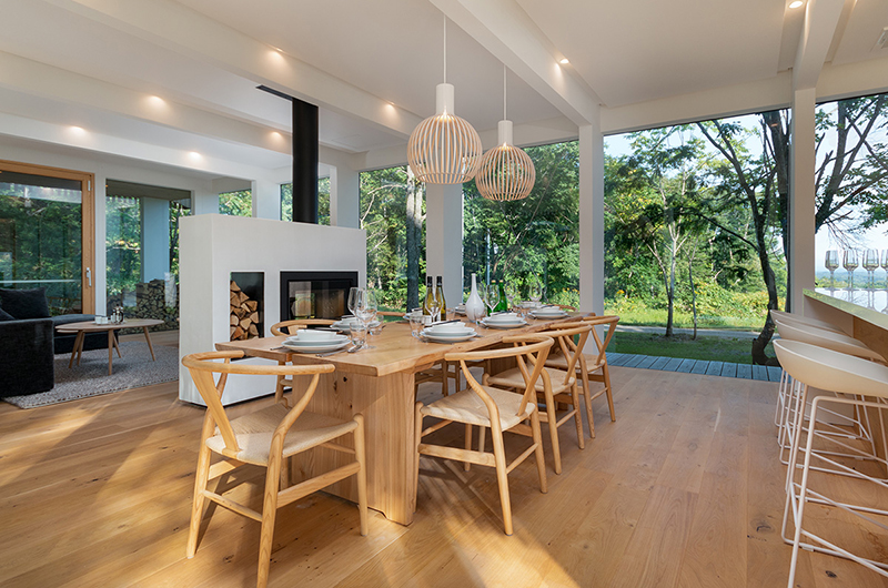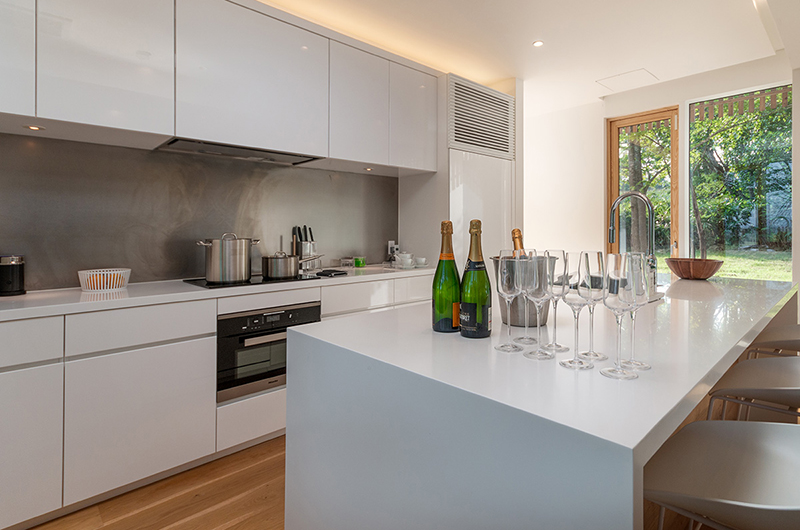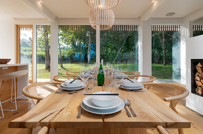 The chalet’s stunning fireplace is the only thing separating the living room from the dining area. Sadly it’s not available for use by customers staying. The light timber dining table is positioned close to the fireside which is cleverly designed so that you can admire the fire from both sides of this open plan space. Besides the fireplace, the dining area also offers beautiful views of the surrounding nature through full wall windows. The dining area is followed by a chic, fully equipped kitchen that features a sleek island and all the gadgets and crockery you’ll need.