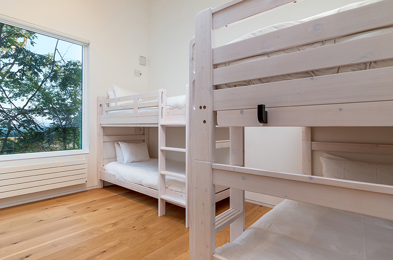 Yukihyo features five bedrooms designed to be soothing sanctuaries amid Niseko’s thrilling slopes. The bedrooms are dominated by calm shades of white and light timber. There’s a whole range of bedding arrangements to choose from. Three rooms feature king-sized beds that can be converted into twin beds if needed. One room features two sets of bunk beds and as it adjoins the media room, it’s the perfect retreat for kids, teens or adults looking to be entertained. The fifth room is a smaller “maid’s” bedroom that features a single bed.