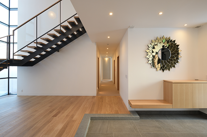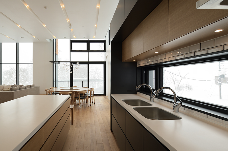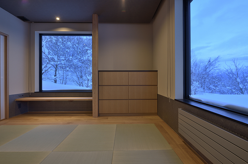 The dining area is beautiful from all angles. It is dominated by a circular dining table surrounded by 10 chairs and lit up by a lamp that seems to mimic the delicate beauty of Niseko’s frozen forests. The dining space is surrounded by full wall windows on one side and slim windows on the other, creating a beautiful dance between shadow and light. The dining area is a part of the open plan space that takes up most of the chalet’s upper floor. With the dining and living areas and the kitchen all included into the same space, socialising and swapping stories comes easy.